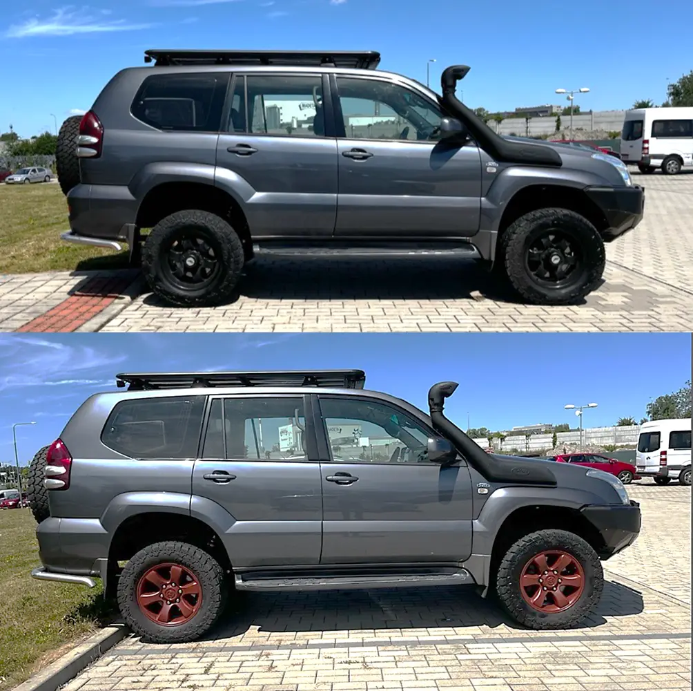 The rims got a stylish, earthy tone—already blending with the mud before I even hit it. A Rhino Rack expedition roof rack paired with an ARB LED bar has officially conquered the night.